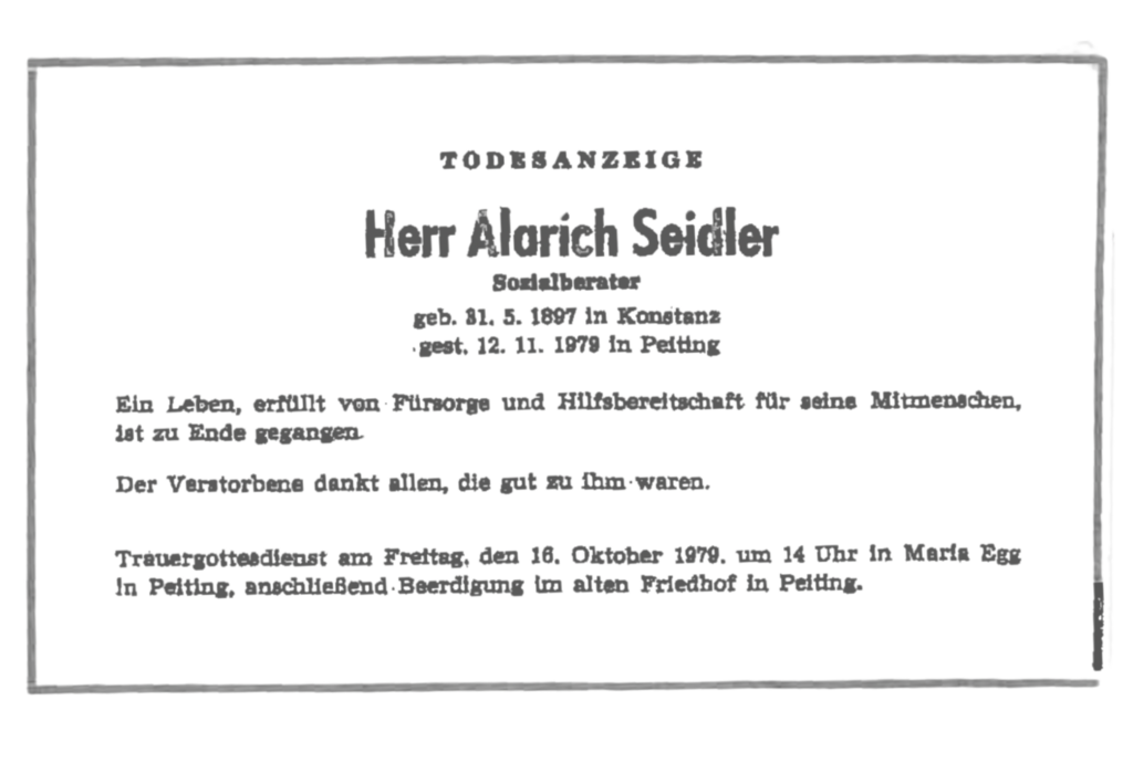 Mit dem Kriegsende unternahm er einen Selbstmordversuch, um sich einer Verhaftung durch die Amerikaner zu entziehen. Da dieser misslang, wurde verhaftet und zwischen 1945 und 1947 interniert. Aus heutiger Sicht muss es mehr als erstaunen, dass sein sogenanntes Entnazifizierungsverfahren fĂŒr ihn erfolgreich zu Ende ging. Durch den Spruchkammerbeschluss vom 17. Dezember 1948 wurde als "entlastet" eingestuft. Bis zu seinem Tod im Jahr 1979 lebte Seidler in Peiting. Niemals hat er sich zu seinen Taten bekannt, Schuld eingestanden oder Reue gezeigt. Er inszenierte sich stattdessen als Opfer und Verkannter.