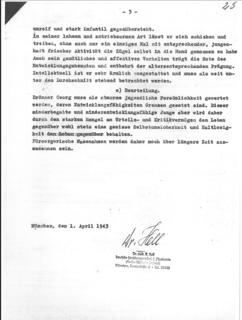 "abnorme jugendliche Persönlichkeit" – Die 'Wissenschaftlerin' Dr. Katharina Hell im Auftrag der Deutschen Forschungsanstalt für Psychiatrie in einem Gutachten über Georg Brönner, 1943.