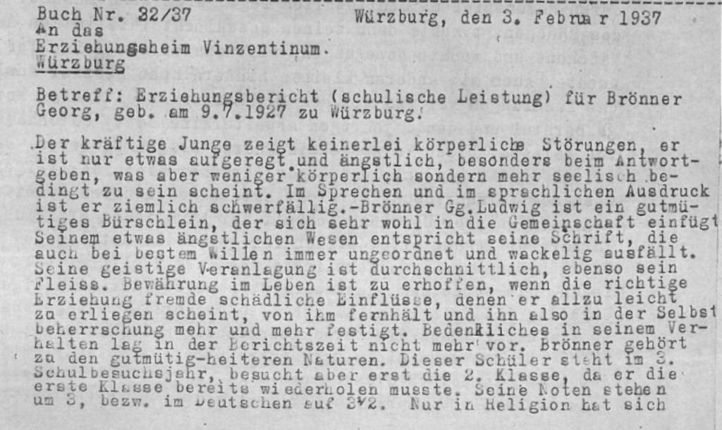 "verspricht Georg Brönner ein tüchtiger Junge zu werden" – Schul- und Fürsorgebericht des 'Fürsorgeheims' der Vinzentinerinnen Würzburg über Georg aus dem Jahr, 1937.