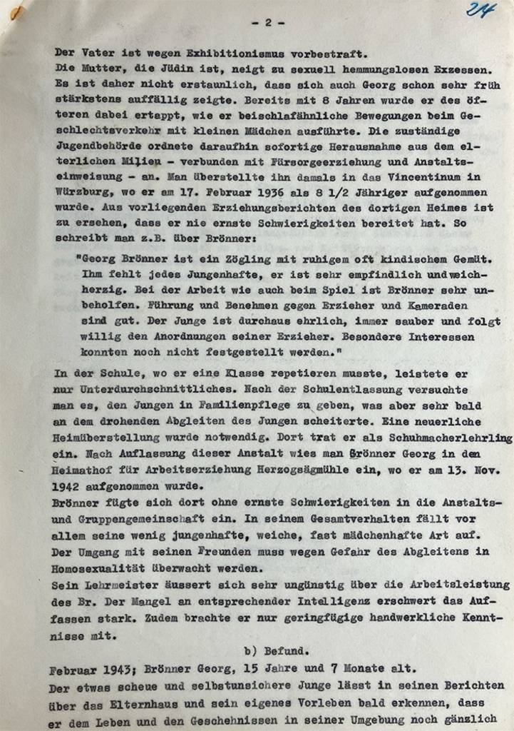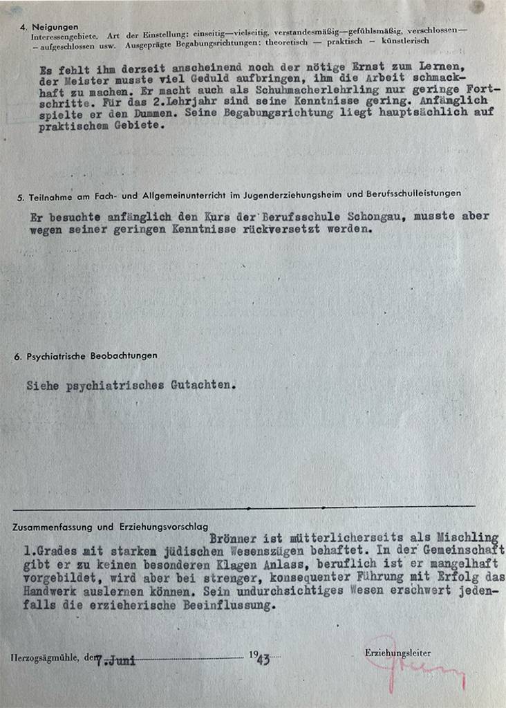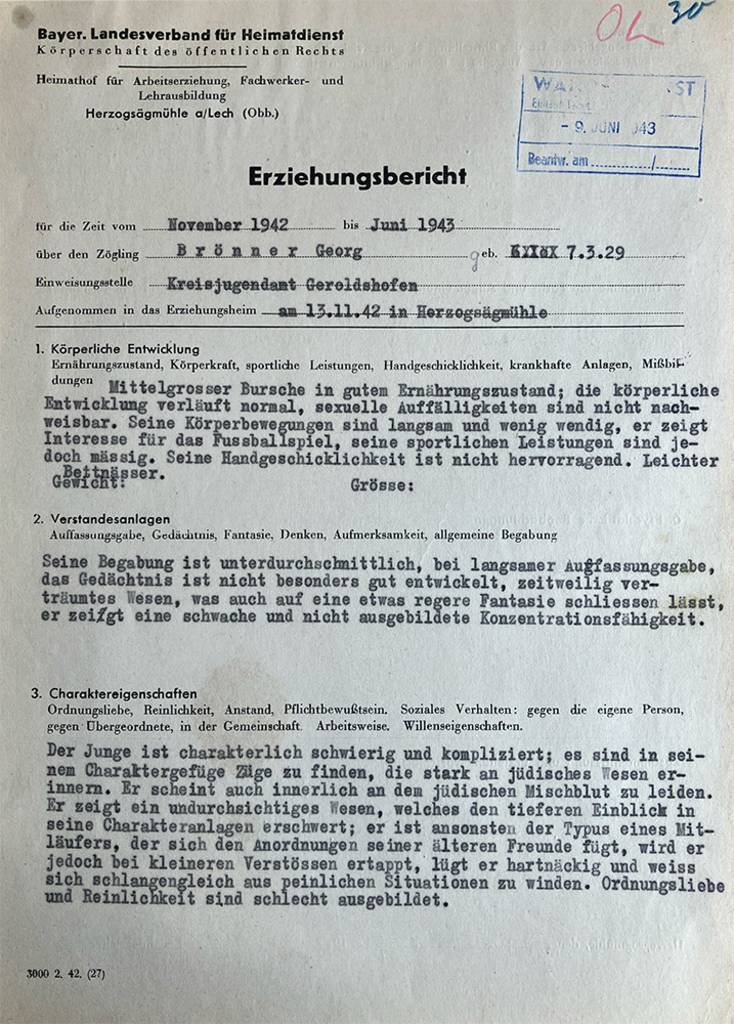 "Er scheint auch innerlich an dem jüdischen Mischblut zu leiden." – Friedrich Goller, Leiter der 'Fürsorgeerziehungsabteilung' und nach Kriegsende Direktor der Einrichtung Herzogsägmühle, 1943.