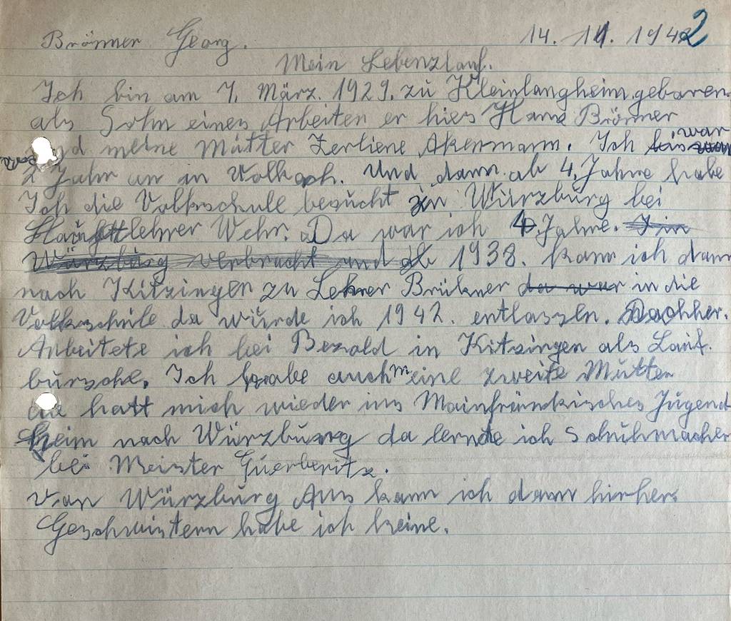 Georg Brönner schrieb in einem eigenhändigen Lebenslauf über sich: "Ich bin am 7. März 1929 in Kleinlangheim geboren als Sohn eines Arbeiters [.]er hieß Hans Brönner und meine Mutter Zerliene Ackermann. Ich war 2 Jahre in Volkach. Und dann ab dem 4. Jahr habe ich Volksschule in Würzburg besucht bei Hauptschullehrer Wehr. Da war ich 4 Jahre. 1938 kam ich dann nach Kitzingen zu Lehrer Brückner in die Volksschule. Da wurde ich 1942 entlassen. Danach arbeitete ich bei Bezold in Kitzingen als Laufbursche. Ich habe auch meine zweite Mutter. Die hat mich wieder ins Mainfränkische Jugendheim nach Würzburg gebracht. Da lernte ich Schuhmacher bei Meister Guerberitze. Von Würzburg aus kam ich dann hierher [nach Herzogsägmühle]. Geschwister habe ich keine."