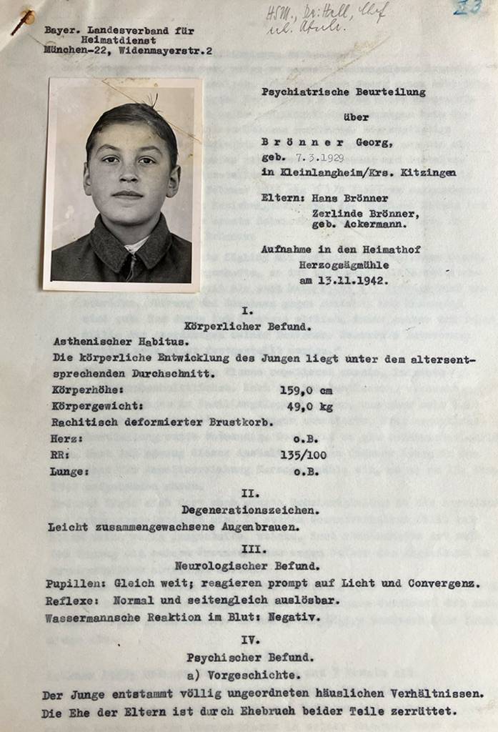 Der "bekannte Rassenhygieniker und Direktor der Deutschen Forschungsanstalt für Psychiatrie in München, Prof. Dr. Ernst Rüdin, [ließ] Anfang des Jahres 1943 Informationen über den schulischen Werdegang von Georg bei der Volksschule Kitzingen wie auch der Berufsschule in Schongau einholen. Er bitte für seine 'wichtige genealogische Arbeit über die geistige und charakterliche, auch körperliche Beschaffenheit einer hier erfassbaren Bevölkerungsgruppe mitzuteilen, wie die Schulleistungen, Begabungs- und Charakteranlagen etc. von Brübber G. in Kl. Langheim, welcher die dortige Schule bei Herrn Lehrer Brückner besuchte, waren.'"
