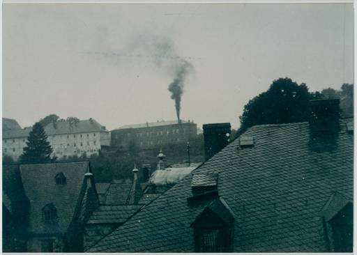 Die Tötungsanstalt Hadamar im Jahr 1941. Der dicke schwarze Qualm aus dem Schornstein war bekannt für viele dieser Anstalten: Getötete Menschen wurden verbrannt – inmitten deutscher Städte.