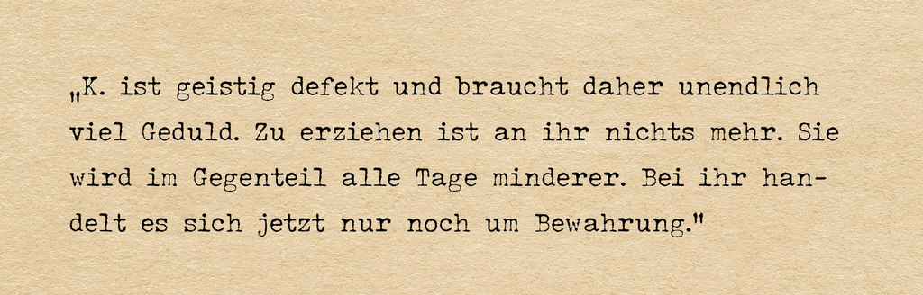 Mit 18 Jahren, am 30. Januar 1939, wurde sie aus der 'Fürsorge' entlassen. Auch über ihre Zeit im Heim finden sich fast nur negative Beurteilungen. Im Abschlussbericht hieß es, sie sei „unerziehbar“ und solle künftig „bewahrt“ werden – also dauerhaft untergebracht. Die Einrichtung, die fast sieben Jahre lang für ihre Erziehung zuständig war, sprach ihr damit ab, ein eigenständiges Leben führen zu können: „K. ist geistig defekt […] Zu erziehen ist an ihr nichts mehr.“