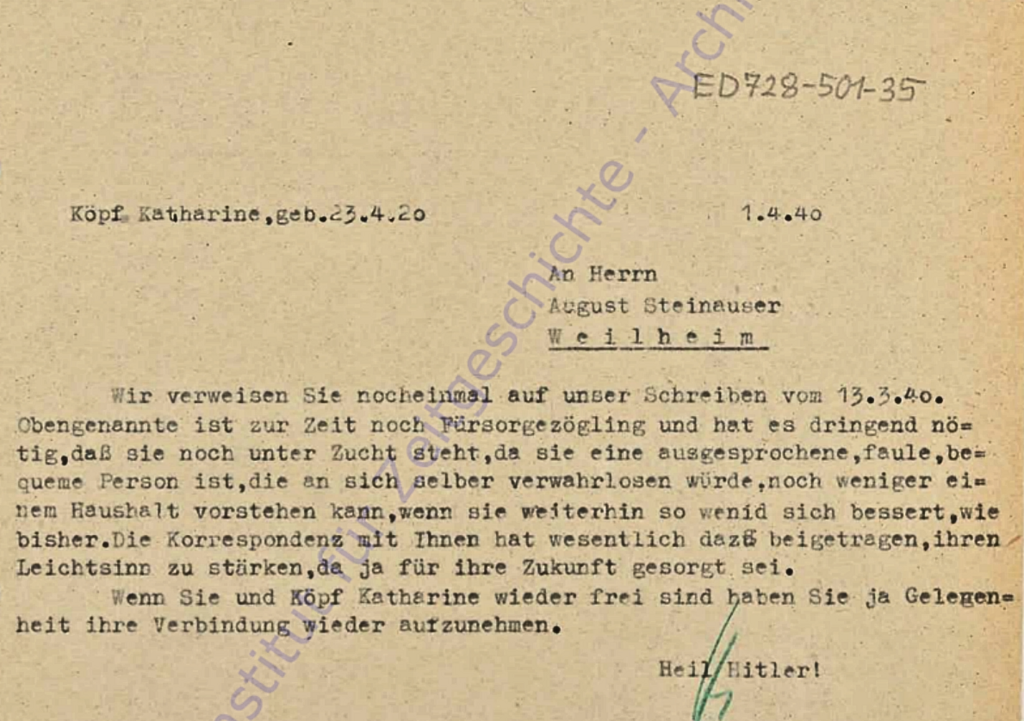 Welche sozialen Konsequenzen eine Einweisung in einen Wanderhof haben konnte, zeigt unter anderem dieses Schreiben des Anstaltsleiters Ludwig Hägele an August Steinhauser, der in Kontakt mit Katharina bleiben wollte.