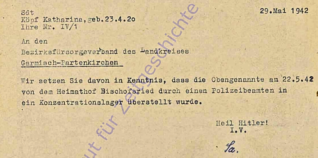 Am Tag ihrer Einweisung machte Katharina Köpf folgende Angaben: „Ich kam 1932 in Fürsorgeerziehung in die Anstalt Josefshaus Marktl am Inn. Am 30. 1.1939 wurde ich dort entlassen und ging 14 Tage zu meinen Eltern nach Graswang und Ende Februar nahm ich eine Stelle an bei Frau Rutz in Garmisch. Am 15. Mai ging ich dort weg und ging zu Schuster Lechner in Stellung, die ich am 17. Juni verließ und nach ein paar Tagen wurde ich in Garmisch verhaftet und bekam 2 Monate Haft und anschließend wurde ich durch den Fürsorgeverband Garmisch am 1.9.39 in den Heimathof Bischofsried eingewiesen.“