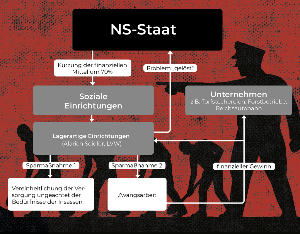 Das Konzept ging weit über gewöhnliche sozialpolitische Sparmaßnahmen hinaus: In den folgenden zwölf Jahren wurden rund 70 % der ambulanten Hilfen gestrichen, die zuvor der Linderung individueller Notlagen dienten. Gleichzeitig stieg die Zahl der Zwangseinweisungen in psychiatrische Einrichtungen, 'Fürsorgeheime', Gefängnisse und Konzentrationslager drastisch an. Viele Betroffene erhielten keine medizinische Behandlung mehr, wurden gezielt unterversorgt oder fielen sogar systematischen Tötungen zum Opfer.
